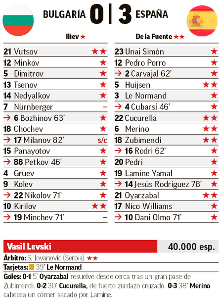 Водещите спортни медии в Испания несъмнено останаха удовлетворени от представянето на националния си тим при безапелационната победа с 3:0 над България в София в първия мач на двата отбора от квалификациите за Мондиал 2026. Ето за какво изданията бяха великодушни в оценките си за играчите на Луис де ла Фуенте в дуела.