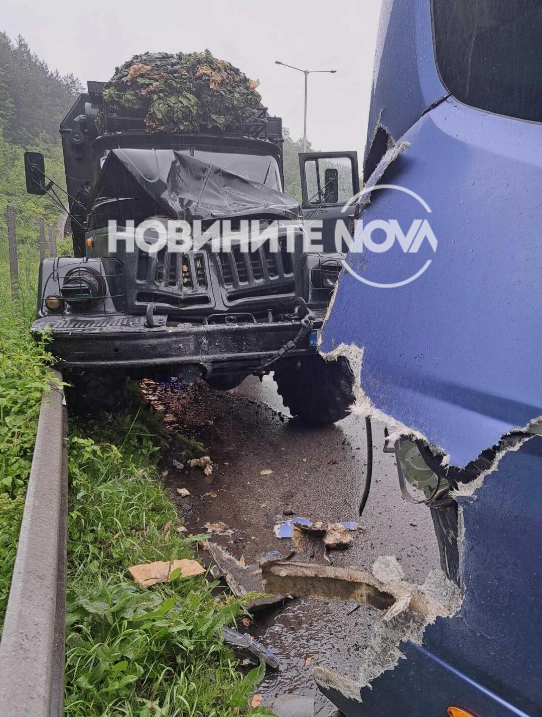 Министерство на вътрешните работи удостовери за случая, който по знамение се е разминал единствено с материални вреди. На въпрос на NOVA за какво е бил спрян бусът на автомагистралата, оттова дадоха отговор, че се е движил без светлини. Съставен е акт на водача на военния камион, който се е движил в спешната лента и е блъснал буса.
