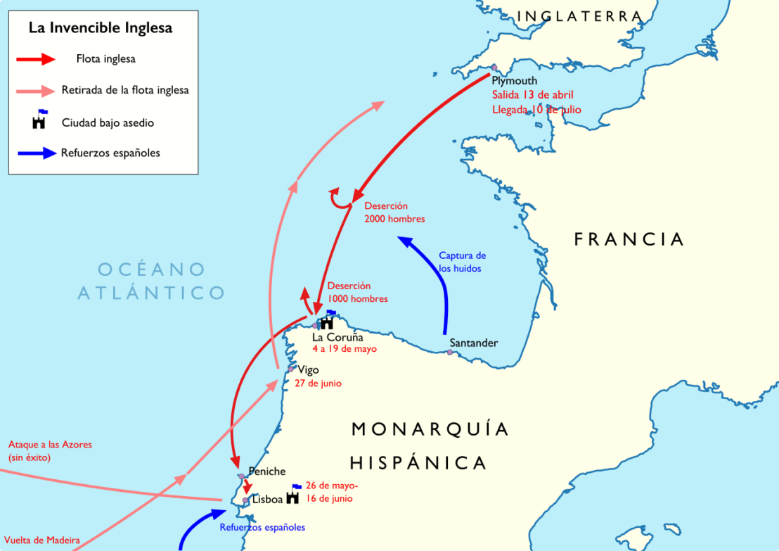През 1587 година, година преди Великата армада, британският корсар и аристократ сър Франсис Дрейк съумява да нападна сполучливо и да разграби значимото испанско пристанище Кадис. Този рейд е и съответният мотив за изпращането на Великата армада през 1588 година По време на приготовленията за ответния удар след провалената испанска експедиция, англичаните се надяват че могат елементарно да повторят подвига на Дрейк, само че и доста повече. По персонално гледище на кралица Елизабет е направен комплициран проект, който планува британския флот да се спусне от Острова към Пиренеите, да нападна главните испански корабостроителници в Ла Коруня, Сан Себастиан и Сантандер, след което да завие на юг и да превземе Лисабон.