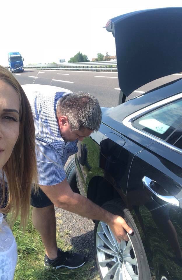 " Да си вземеш новара А8 от Hertz с гвоздей - екстра и да спукаш гума на магистралат на 40-градусова горещина. Първи път промяна на гума и с общи старания за 10 мин. ", написа русокосата красавица във Facebook.