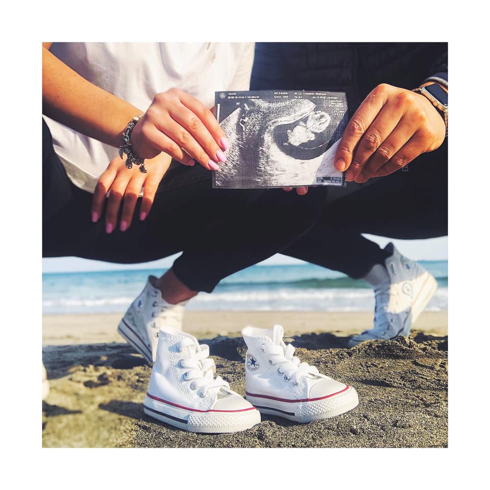 Красавицата заяви новината, споделяйки забавен кадър в обществените мрежи. На него двамата бъдещи родители театралничат на брега на морето с ехографска фотография на наследника си. На пясъка пред тях пък се виждат и чифт мънички спортни обувки, каквито и те носят на фотоса.