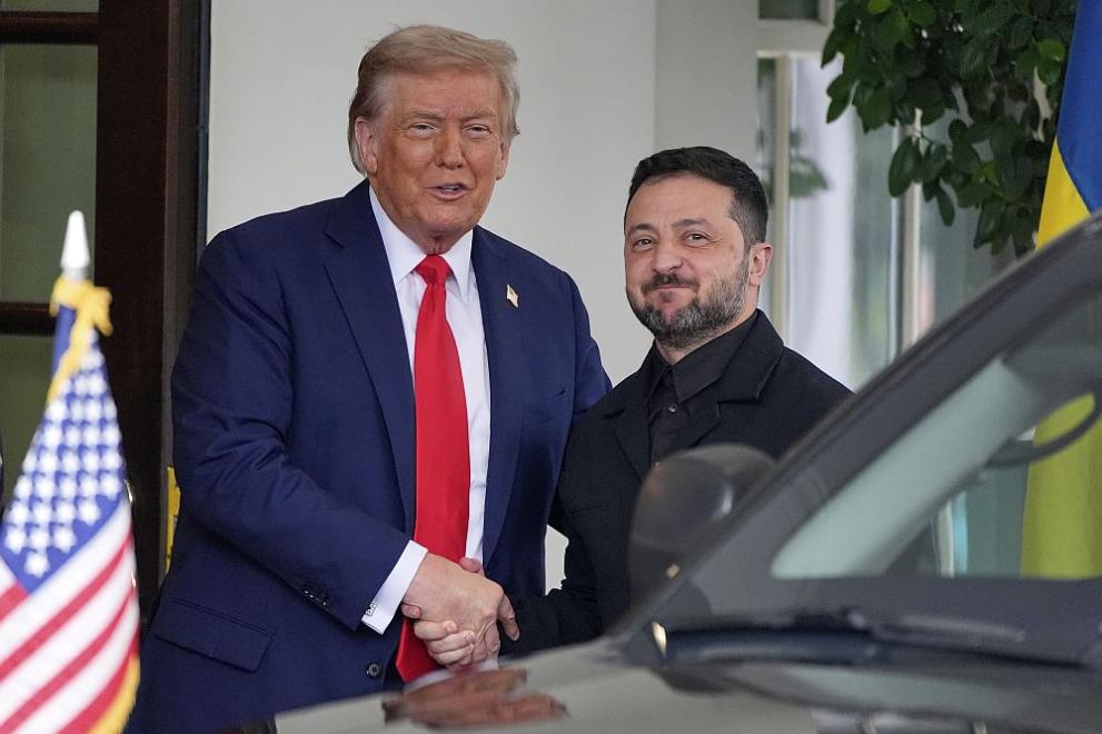 Президентът Тръмп посрещна украинския водач на входа на западното крило на Белия дом. Тръмп подвигна пестник , когато автомобилът със Зеленски спря, а по-късно стисна ръката на госта си.