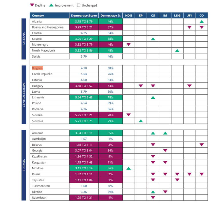 Изследвани са 29 страни от Източна Европа и някогашните руски републики - така наречен източен блок от времето на студената война - с цел да се наблюдава демократичното им развиване (това е повода Гърция и Турция от нашия регион да не са обхванати). Текстът е за интервала до края на 2021 година