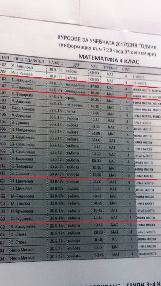 Чакайки в учебното заведение, видяхме стотиците купи на наградени възпитаници от гимназията от математически надпревари. Те изпълват две стъклени витрини от край до завършек на две стени на първия етаж. Натъкнахме се и на още нещо - разписанието на курсовете по математика за идната 2017/2018 година В описите видяхме, че и Тодорова, и пенсионираната и.д. директорка ще водят такива, както и учителката със срочен неподновен контракт Ана Илиева.