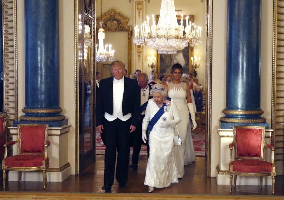 Впечатляващи тоалети , множеството от които бели, бяха демонстрирани на банкета, даден от кралица Елизабет Втора в чест на американския президент Доналд Тръмп и брачната половинка му Мелания , написа в. " Сън ".