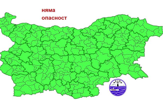 Няма оповестени предупредителни кодове за рискови феномени. Картата на Национален институт по метеорология и хидрология е оцветена в зелено.