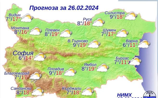 Впонеделник облачността ще е забележителна, само че единствено на обособени места в Западна България ще превали дъжд. Ще духа слаб до сдържан вятър от изток-югоизток. Максималните температури ще са сред 14° и 19°, в София - към 14°.