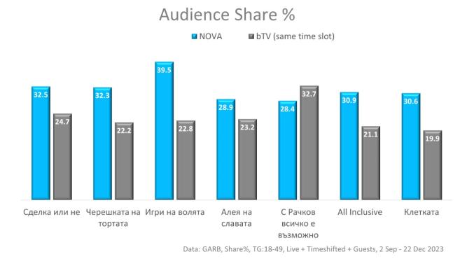 Освен рекорден ефирен сезон, NOVA регистрира и рекорден резултат на развлекателно предаване. Ключовият за праймтайма тази есен пети сезон на рисковия риалити формат „ Игри на волята “ записва най-високия аудиторен дял в историята си – 39,5%. NOVA реализира отлични резултати и при останалите развлекателни излъчвания в най-гледаното време.