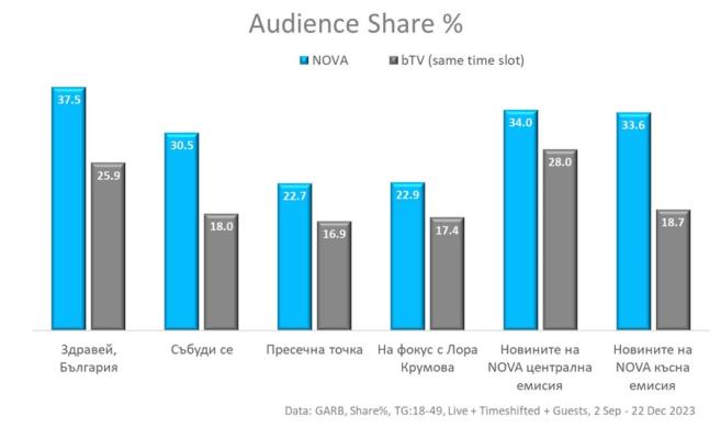 Поради непрекъснатия цикъл на работа, дефиницията на „ ефирен сезон “ при вести и журналистика е по-трудно използвана, само че въпреки всичко, в случай че условно ограничим прелетния сезон в седмици 7-20 и есенния в седмици 37-48, то пет от изброените шест излъчвания на NOVA регистрират и върхове в своята история през есента на 2023 година. Най-висок резултат реализират „ Здравей, България “, „ Събуди се “, „ На фокус с Лора Крумова “, както и централната и късната емисия на Новините на NOVA. Лидерството се резервира и при по-широката възрастова група – хората на възраст 18-59 година С това екипът на „ Новини и настоящи излъчвания “ отбелязва най-успешната си година досега.