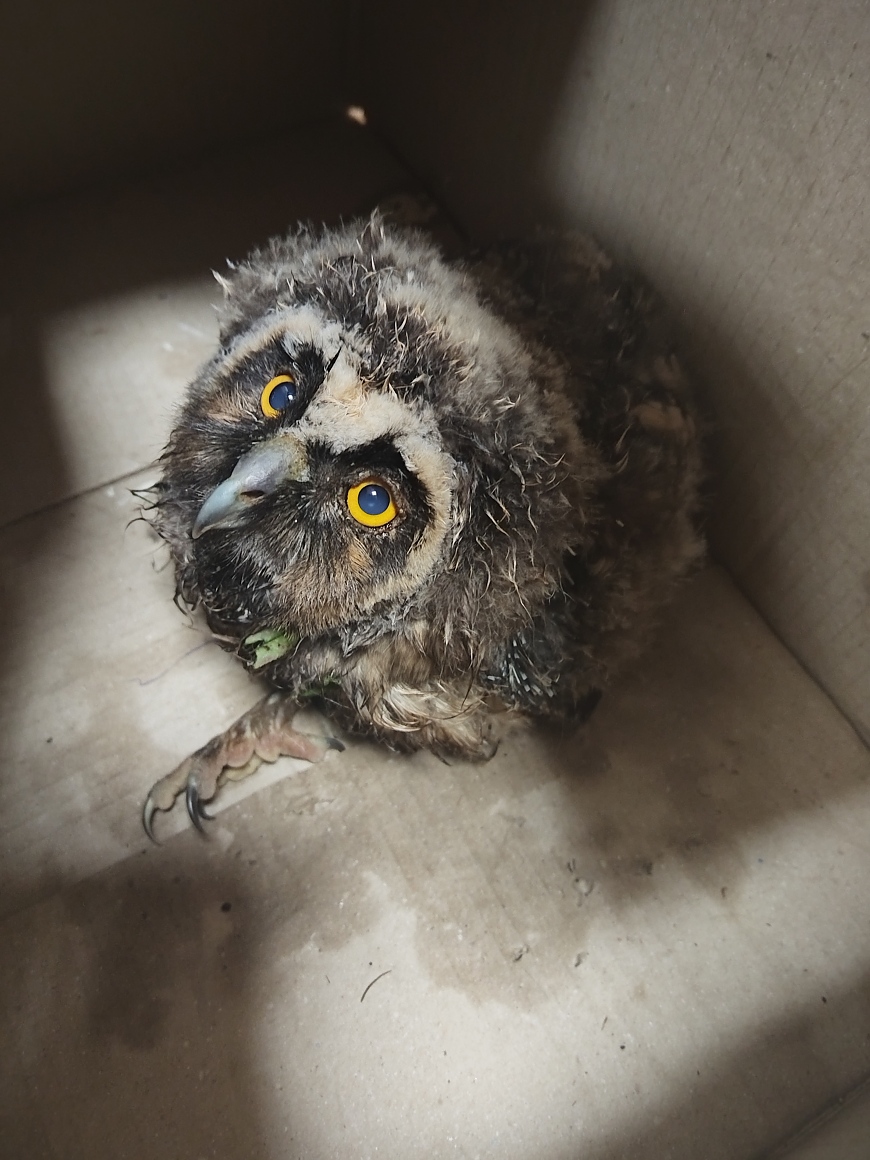 Със съдействието на чиновници от общината в Бяла Слатин совата неотложно била превозена до екоинспекцията във Враца. При първичен оглед се видяло, че младият образец от типа Горска ушата сова (Asio otus) е с забележима контузия на краката.