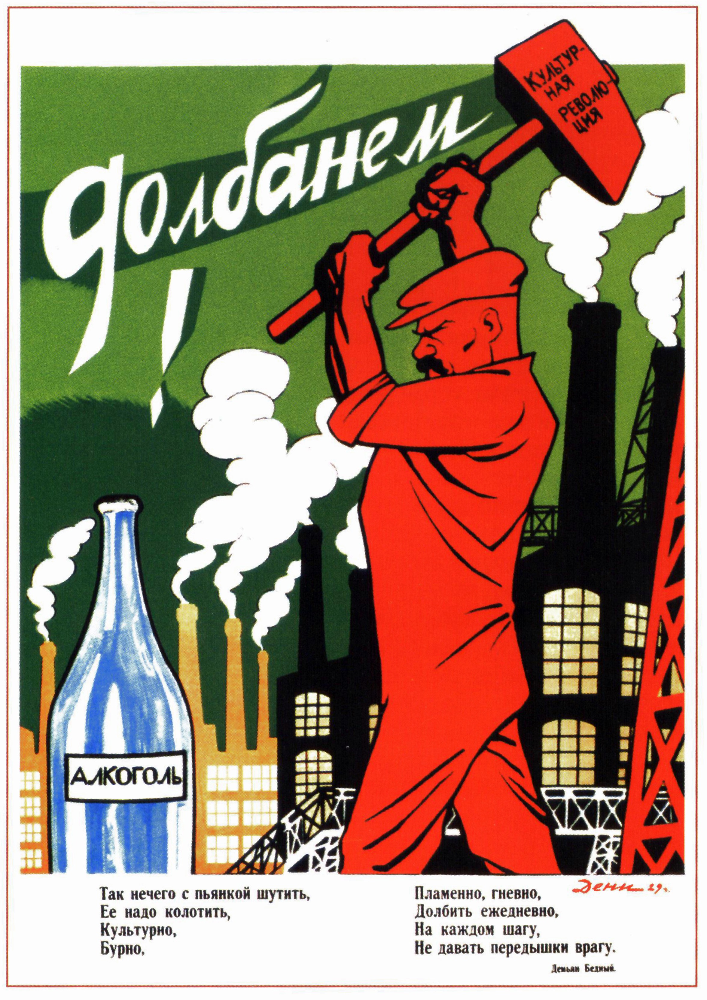 „ Врагът – вън от руския ни дом! ”, „ Бий алкохола! ”, „ Преходът към „ оня ” свят ”, „ Спирт или Спорт ”. С сходни тържествени послания руските художници са се борили с пиянството на един народ. Доколко да съумели – това не е въпрос, подложен на проучване. Но ентусиазмът на злоупотребата със спиртни питиета през предишния век е бил еднакъв на олимпийски спорт, и са били взети съответните ограничения. Ярки метафори, артистични гротески, графични уведомления и пропаганда с самоувереност – всичко, в името на трезвеността. Вижте една завладяваща сбирка от антиалкохолните плакати на Съюз на съветските социалистически републики, основани в интервала от 1920 година до 1980 година