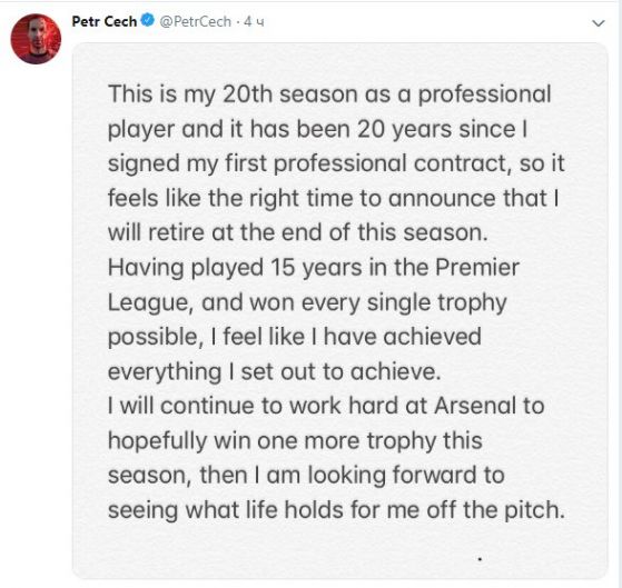 " Минаха 20 години, откогато подписах първия си професионален контракт. Сега усещам като уместно времето да разглася, че ще сложа завършек на кариерата си в края на този сезон ", написа Чех.
