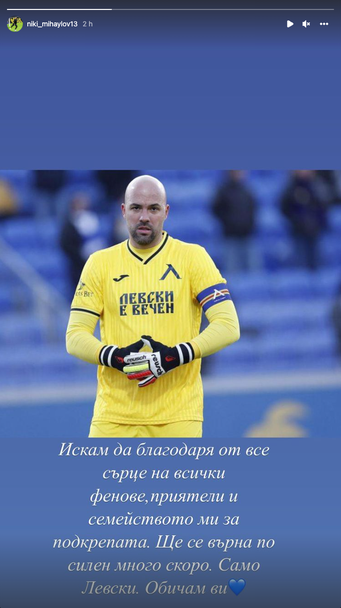 Вратарят на Левски Николай Михайлов употребява профила си в " Инстаграм ", с цел да благодари за поддръжката, която получи в последните часове след травмата, която претърпя при конфликт с Евгений Сердюк от Черно море.