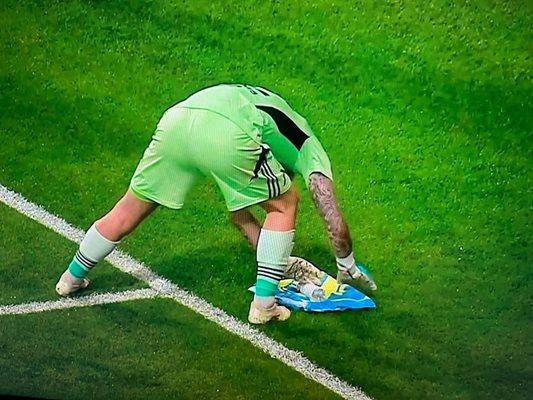 Вратарят отпива три глътки вода при всеки гол на " сините ", обува първо дясната обувка