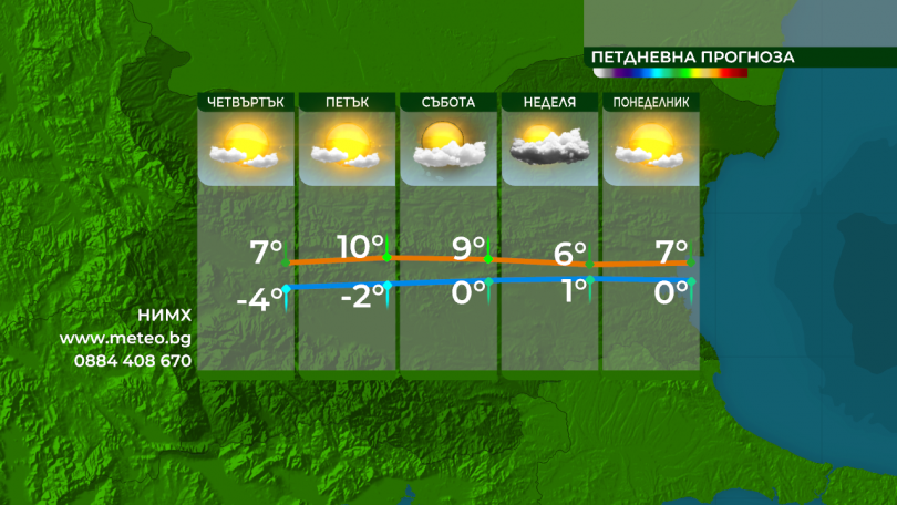 Слънчево ще бъде и в планините, само че прохладно, с сдържан, краткотрайно мощен северен вятър. Температурите ще се покачват и в Боровец ще доближи до към минус 2°, в Пампорово - към минус 3°, по най-високите върхове – към минус 9°.