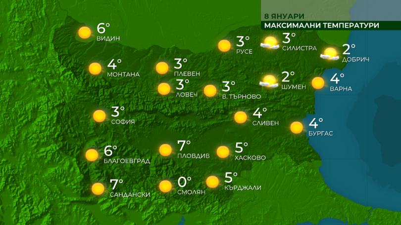 Времето през днешния ден ще бъде слънчево. В Източна България и по Черноморието ще духа сдържан северен вятър. Минималните температури ще бъдат от минус 8° до 1°, в София – минус 6°, оптимални - сред 2° и 7°.