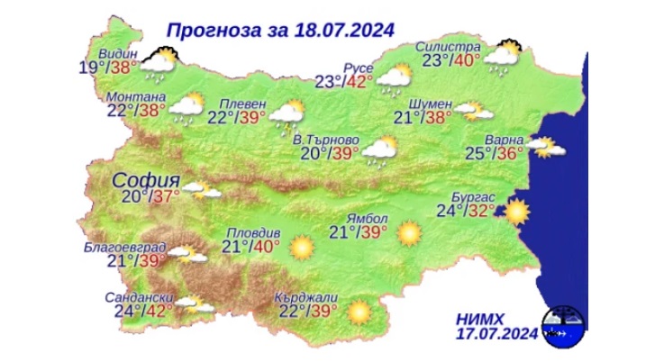 Времето в България на 18 юли ще бъде най-вече слънчево и още веднъж доста горещо. Това съобщават от Национален институт по метеорология и хидрология в своята прогноза.