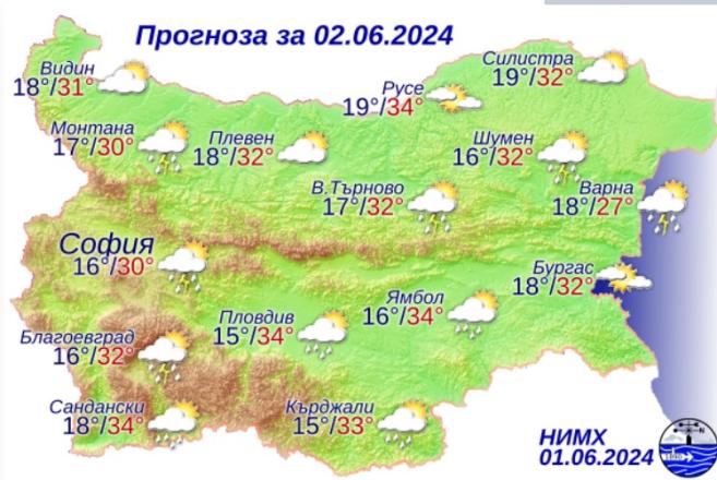 в Югоизточна България ще продължи да духа юг-югозападен вятър и там температурите ще се задържат високи, тук-там до 34-35°. В останалата част от страната вятърът ще се ориентира от северозапад и температурите ще стартират да се намаляват. На доста места в Западна и Централна България ще има следобедни краткотрайни, локално интензивни превалявания и гръмотевични стихии.