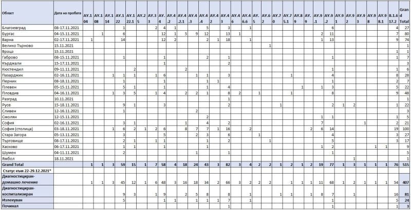 Изследвани са 515 клинични проби, които обаче са взети в интервала 02-18 ноември. Те са изпратени от 51 разнообразни лечебни заведения от 23 области на страната.