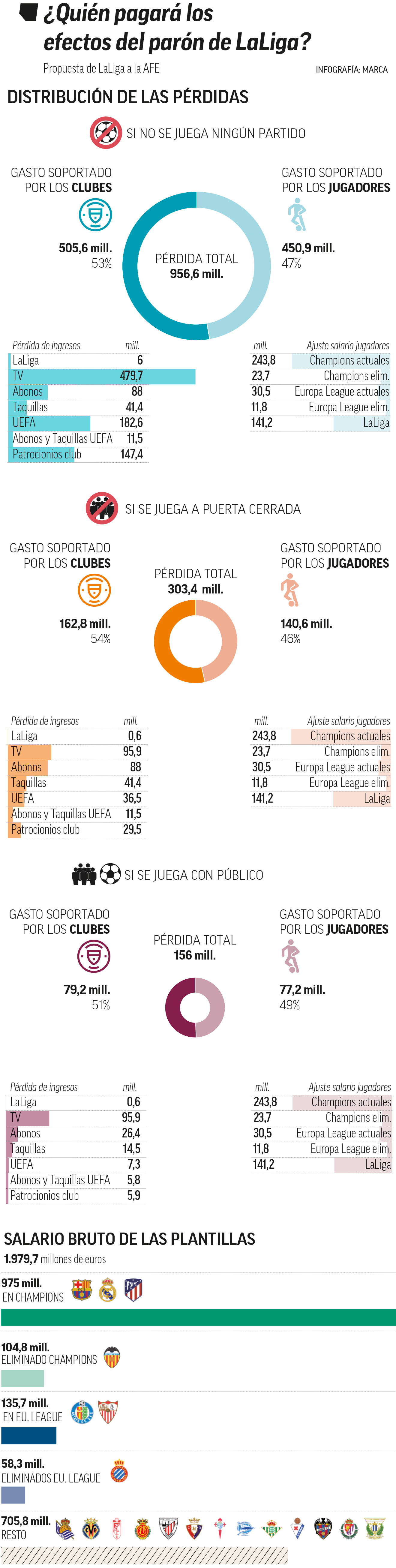Все още няма изясненост по какъв начин и дали ще приключи елитното състезание в Испания и от Marca направиха калкулации на загубите при няколко разновидността. Ако шампионатът въобще не бъде възобновен, Ла Лига ще загуби 956,6 милиона евро. От тях 505,6 милиона ще бъдат от хазните на клубовете и 450,9 млн. от " джобовете " на футболистите.