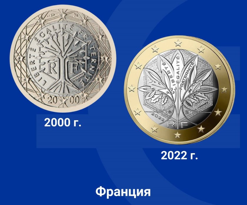 През 2022 година Франция вкарва втора серия монети от 1 Евро и 2 Евро. Новият дизайн включва клончета от дъб и маслина, които образуват дървото на живота и символизират силата, стабилността и мира. Дървото и девизът на Франция са вписани в шестоъгълник.