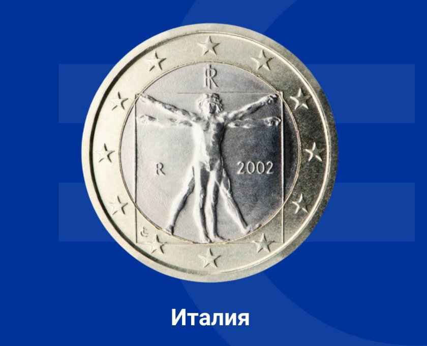 На монетата от 1 евро е пресъздадена известната схема " Витрувиански човек " на Леонардо да Винчи, представяща съвършените пропорции на човешкото тяло, изложена в Gallerie dell` Accademia във Венеция.