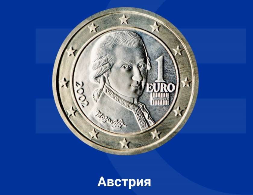 На монетата от 1 евро е показан композиторът Волфганг Амадеус Моцарт, знак на музикалните обичаи на Австрия.