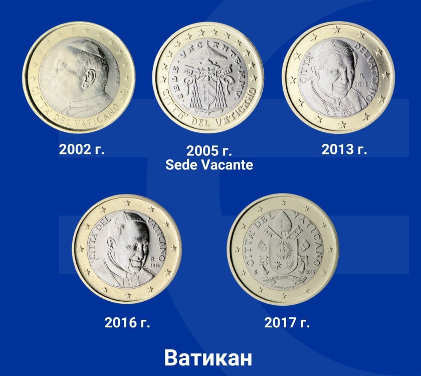 Върху монетите от всички серии са изобразени 12-те звезди на европейското знаме, надписът " CITTÀ DEL VATICANO ", годината на издаване и знакът на монетния двор " R ".