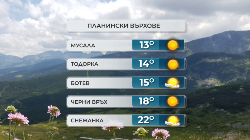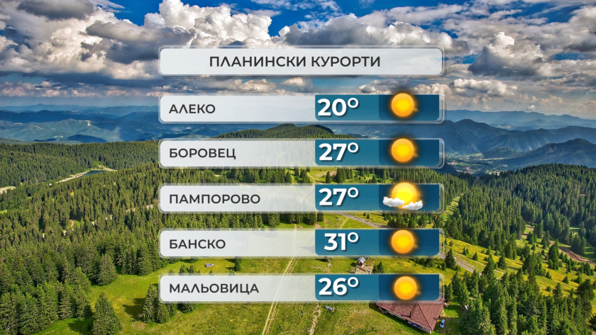 Максималните температури в курортите ще са от 22° на Алеко, 25-26° в Боровец и Пампорово до 28° в Банско.
