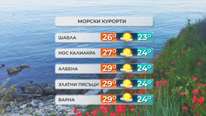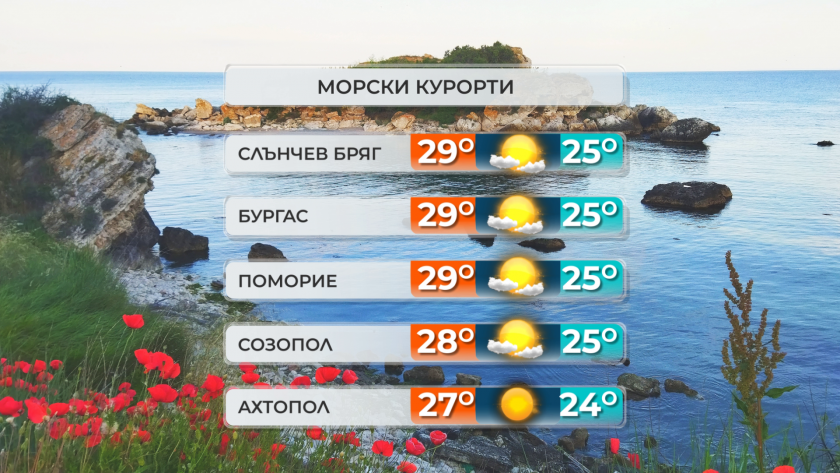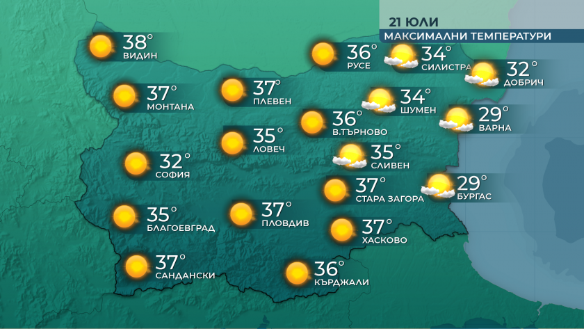 Днес оптималните температури ще бъдат сред 32° и 37°, по Черноморието - от 26° до 29°. В следобедните часове ще остане слънчево, а в по-голямата част от страната – и съвсем безшумно, в източните региони – с сдържан вятър от изток-североизток.