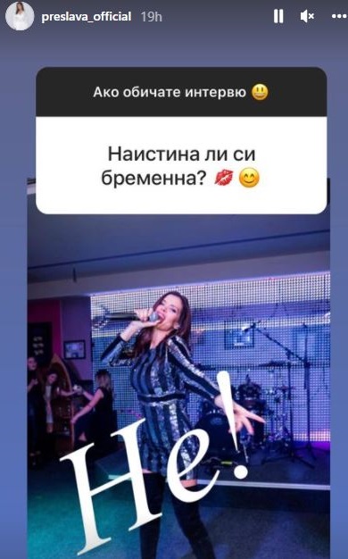 Все по-упорити са слуховете, че фолк звездата Преслава е бременна с второ. Тези спекулации бяха подсилени с няколко фотоси от нейно присъединяване, на които се вижда леко изпъкнало коремче. Цяла седмица изпълнителката на "В твоето легло " легло мълчи и в допълнение ускорява съмненията за втора бременност. Звездата получи хиляди известия от своите фенове и най-сетне се осмели да признае каква е истината. Хитовата певица изрично отхвърли да е бременна за повторно. Поне на този стадий! А нейни почитатели недоумяват коой болен мозък може да съчини сходна нелепост, откакто Преслава наподобява зашеметяващо добре и сега се намира в най-перфектната форма, в каквато в никакъв случай до момента не е била.