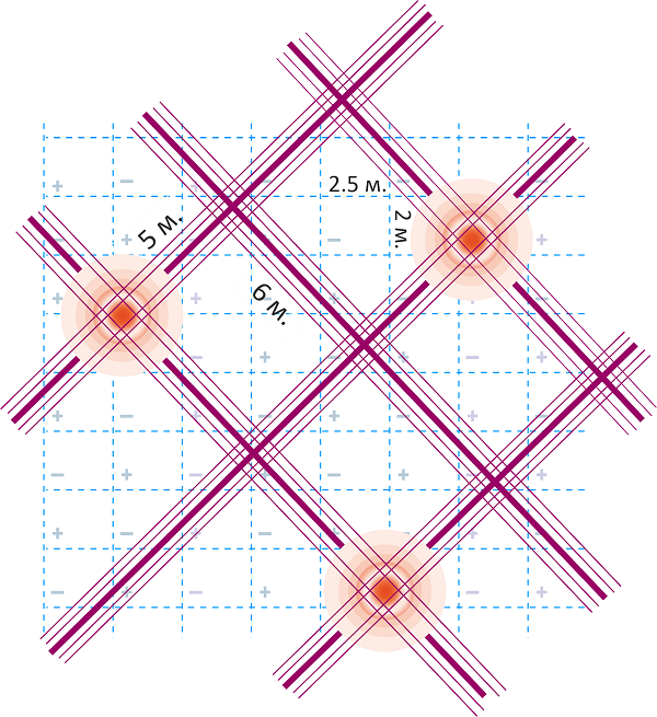 В какво се показва тяхното деяние? Както се вижда на схемата, геомагнитните линии образуват гъста мрежа, като местата на секване (кръстовките) са с редуващ се поляритет – плюс, минус, плюс, минус и така нататък Образуващите се правоъгълници са с два противоположни по диагонала плюсови ъгъла и два минусови. Когато човек спи с глава на север или на изток, магнетизмът на неговото лично тяло е в синхрон с естествения магнетизъм. Ако тялото му се намира по оста на диагоналите в правоъгълника, той попада в линия на минусов или плюсов поляритет, който нарушава неговите енергийни салда. Продължителният престой върху кръстовките на геомрежата също не е желан. Плюсовите кръстовки могат да ви презаредят енергийно и да провокират нараснала нервност. Отрицателните – тъкмо противоположното – могат да „ изсмучат “ силата ви, след което ще се чувствате отпаднали и угнетени.