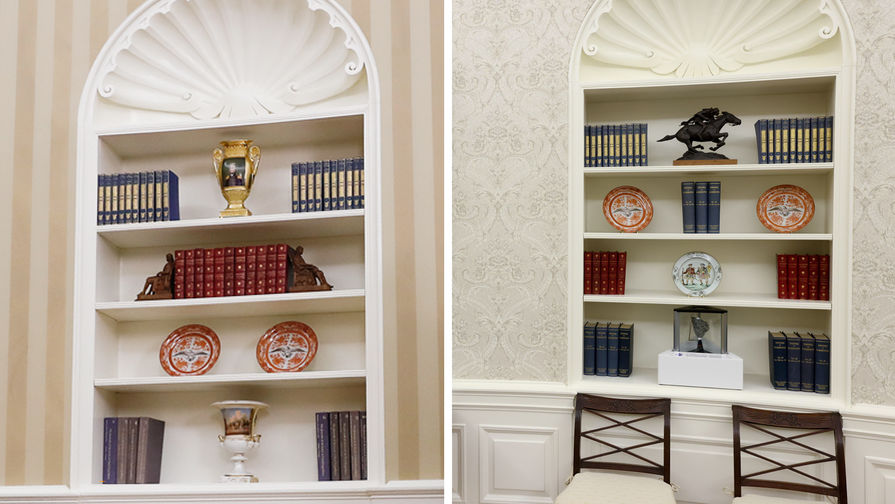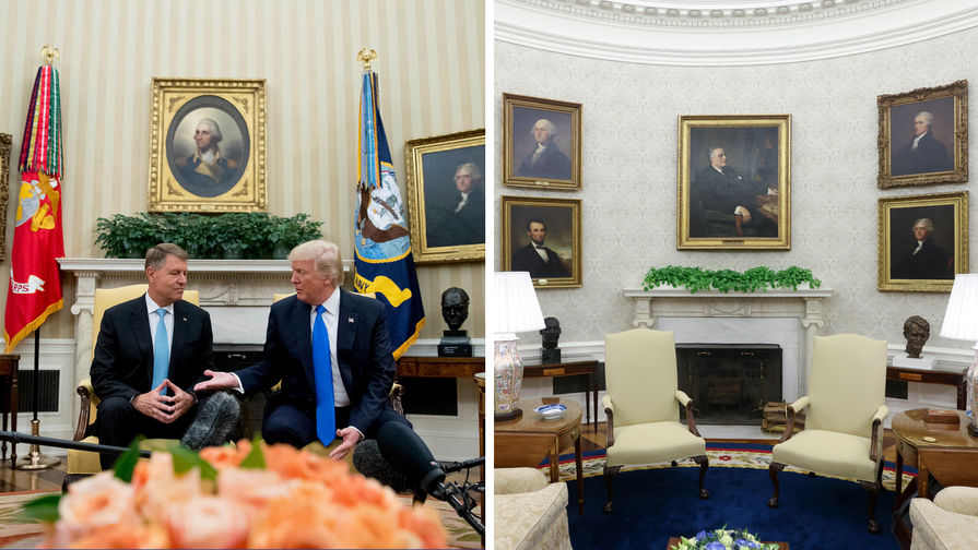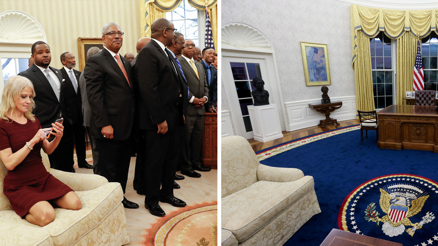 Брокатените дивани в кремав цвят, които се появиха в Овалния кабинет по времето на Тръмп, към този момент остават. Може би Байдън още не е имал време за тях. Те бяха запомнени от американците с етичния скандал, когато по време на посещаване на афроамериканската студентска общественост в Белия дом съветничката на Тръмп Калиан Конуей смъкна обувките си и се качи на дивана. Тя направи това, с цел да снима гостите от по-добър ъгъл, само че мнозина изтълкуваха държанието й като неетично.