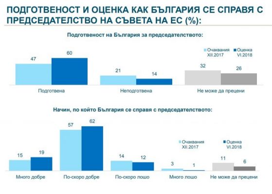 Умерените упования през декември към подготвеността и метода, по който ще се оправи страната ни в това първо по рода си предизвикателство, се трансформират в изрично положителни оценки в неговия край. Мненията готова - неподготвена през декември са 47:21, а през юни 60:14. Тоест в съответствие 4:1 българите показват задоволеност от подготвеността на страната и участващите екипи.