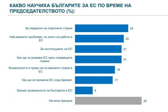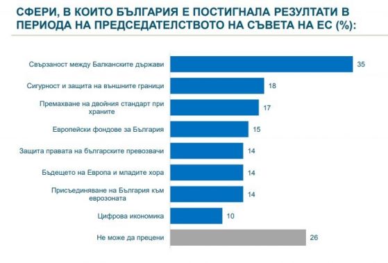 Сферите, за които публичното мнение счита, че страната ни е постигнала резултат са по-фрагментирани. Условно са разграничени на три групи. Безспорният любимец са Балканите – съответни стъпки към реализиране на по-голяма съгласуваност сред страните от района виждат 35%. Втората група се образува от директно засягащи България тематики, като унищожаване на двойния стандарт при храните, европейски фондове за България, отбрана на българските превозвачи, присъединение на БГ към еврозоната. Тук оценките са по-скромни – 22-23% виждат прогрес. И третата група обгръща общи европейски проблеми – външни граници, бъдеще на Европа и младежите, цифрова стопанска система, където сред 18-20% считат, че има развиване.