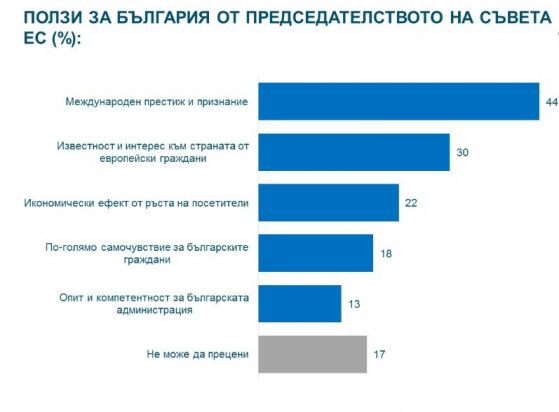 Основните изгоди за България от ротационното председателство жителите виждат в: нараснал интернационален авторитет и самопризнание (44%), нараснала известност и интерес от страна на европейски жители (30%), стопански резултати от растежа на гости (22%). По-сериозна е резервираността на публичното мнение по отношение на цялостните дълготрайни резултати вътре в страната – смяната в самочувствието на българските жители и компетентността на българската администрация (респ. 18% и 13%).