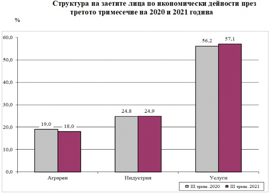 Заетите лица в стопанската система са 3.657 млн., а общият брой отработени часове доближава 1.456 милиарда. Структурата на заетостта по стопански браншове през третото тримесечие на 2021 година по отношение на съответното тримесечие на 2020 година демонстрира нарастване на относителния дял в бранша на услугите и индустриалния бранш и понижение на относителния дял в аграрния бранш.