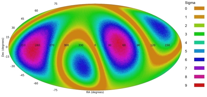 Това, което виждате, е карта на цялото небе на равноплощна псевдоцилиндрична проекция на квадрупола (4 оси) в разпределението на направленията на въртене на галактиките. Различните цветове значат друга статистическа мощ на съществуването на космологичен квадрупол в разнообразни точки на небето. Източник: NASA, ESA, and E. Perlman/Florida Institute of Technology