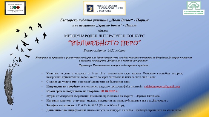 Конкурсът се организира от българското неделно учебно заведение „ Иван Вазов “ към асоциация „ Христо Ботев “ в Париж с финансовата поддръжка на Министерството на образованието и науката по план в границите на стратегия „ Роден език и просвета зад граница “ и в съдействие с Изпълнителната организация за българите в чужбина.