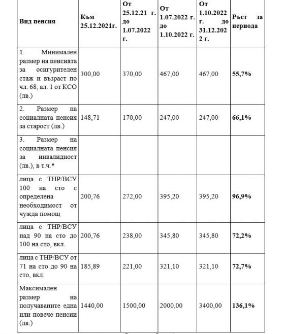 От 1 юли 2022 година пенсиите за трудова активност, отпуснати до 31 декември 2021 година, бяха увеличени с 10% - с 3,9 пункта повече, в сравнение с би следвало да бъдат увеличени, в случай че процентът бе изчислен при използване на правилото на член 100 от Кодекса за обществено обезпечаване (6,1 на сто). От същата дата в размера на пенсиите бяха включени така наречен коронавирус добавка от 60 лева и изплащаните самостоятелни обезщетения за разликата сред изплащаните от Национален осигурителен институт суми за декември 2021 година и тези за януари 2022 година По подобен метод беше нараснал и размерът на обществената пенсия за напреднала възраст, което докара до увеличение на всички пенсии, несвързани с трудова активност. Ковид добавката от 60 лева беше включена и в размера на трудовите пенсии, отпуснати сред 1 януари и 30 юни 2022 година Същата сума се прибавя и към всички пенсии, отпуснати след 1 юли 2022 година