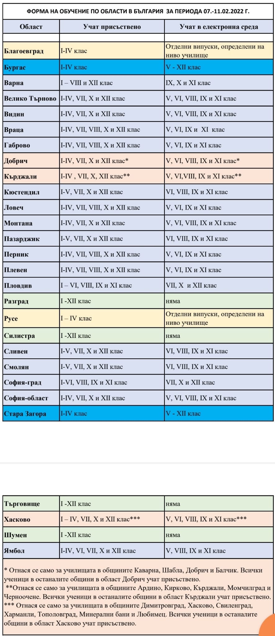 В областите Бургас и Стара Загора всички възпитаници от V до XII клас ще имат занятия в електронна среда през идната седмица. В останалите 22 области вторият период ще стартира онлайн за обособени випуски от прогимназиалния и гимназиалния стадий. В областите Добрич, Кърджали и Хасково някои класове ще учат от у дома единствено в обособени общини. Останалите ще се в клас.