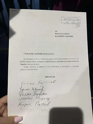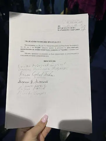 Пеевски сподели, че обича постоянно да приказва с обстоятелства и даде на медиите ксерокопия от планове на решения на Народното събрание, подписани от него, Бойко Борисов, Христо Иванов, Кирил Петков и Ивайло Мирчев за даване на спомагателна военна помощ за Украйна.