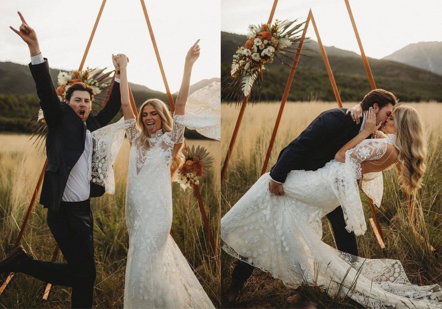 На фрагмента булката е застанала с тил към фотографа, а брачният партньор й я е прегърнал, заравяйки лице в шията на избраницата си. Той се усмихва закачливо, само че това не е всичко.