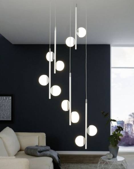 Представете си всекидневна с огромен ъглов диван до стената пред него в свободното пространство холна масичка върху кръговиден килим, а над тях огромен кръговиден полилей, състоящ се от кръг с диаметър 2 метра, който разпръсква нежна LED светлина в цялата стая. Отлично дизайнерско решение, което следва симетрията на тавана и на пода. Комбинацията от няколко текстилни плафона, ситуирани един до различен също е превъзходен образец за XXL осветяване, което ще се трансформира във фокусна точка на стаята.