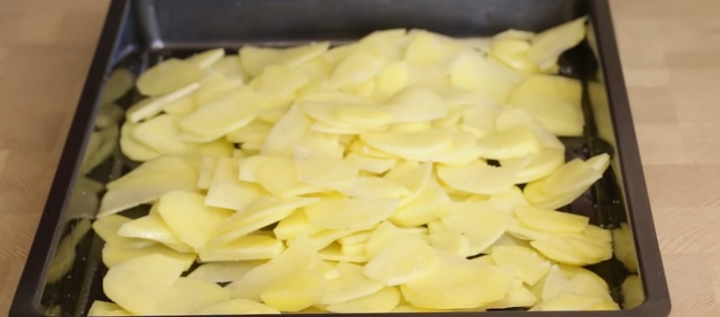 Нанесете филийки картофи отмерено върху тава за печене, намазана с слънчогледово масло. Поръсете ги със сол, черен пипер и разбъркайте.
