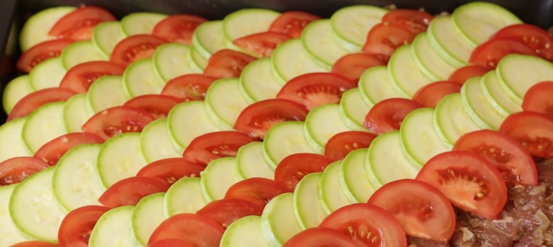 Следващият пласт е ред на каймата. След това подредите тиквичките и доматите. Изпратете във фурната, загрята до 200 градуса за 30-40 минути.