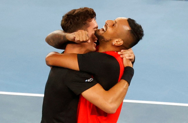 " Лошото момче на тениса " Ник Кириос сервира за купата и крайното 7-5, 6-4, преди да прегърне съотборника си и другар от детинство на мрежата.