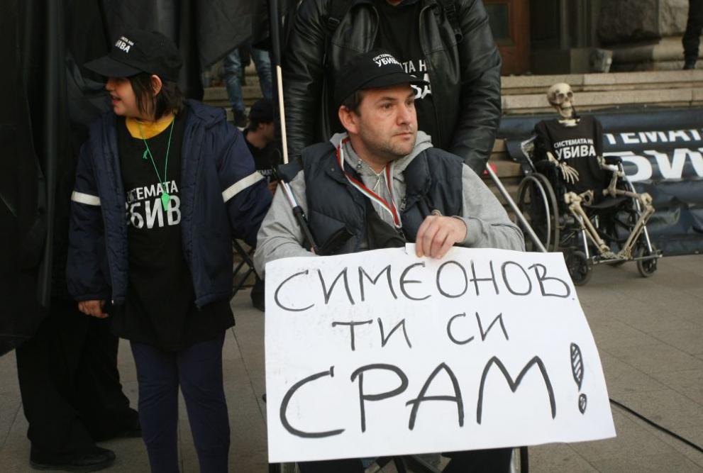 БГНЕС Протестиращите скандират " Оставка " , носят плакати " Симонов - позор ", " За душата с увреждания няма протези и рехабилитация ", както и плакати с облика на вицепремиера, видоизменен като Хитлер. Те носят и черни флагове.