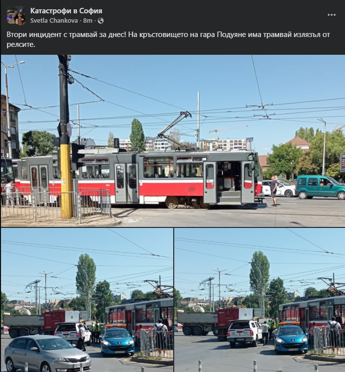Втори случай с трамвай за през днешния ден! На кръстовището на гара Подуяне има трамвай излязъл от релсите. Това оповестиха очевидци в фейсбук групата „ Катастрофи в София “.
