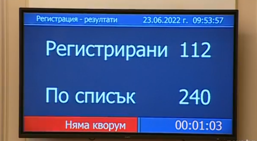 „ Регистрирани са 112 народни представители. Уважаеми сътрудници, още веднъж не можем да съберем нужния кворум. Явно е значимо да бъде гласуван избор на съмнение към държавното управление, само че не и Народното събрание да продължи естествения си ход на работа. Днес явно няма да можем да работи “, съобщи краткотрайно изпълняващият длъжността на ръководител Мирослав Иванов.
